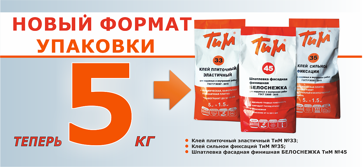 Линейка марки "ТиМ" - это клеевые смеси, штукатурные и шпатлевочные смеси, смеси для полов (в том числе, наливные полы, ровнители), грунтовки и др. - всего более 30 наименований. Особое место в ассортименте «ТиМ» занимает линейка "ТиМ-Эффект" - эксклюзивное предложение для мастеров-профессионалов в сфере отделочных работ.
